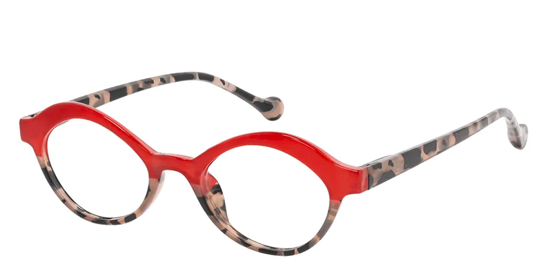 Oval red-tortoiseshell mixed reading glasses are a fusion of classic and cool. The oval shape with tortoiseshell patterned frames exudes retro charm and modern style. These glasses are perfect for those who appreciate vintage-inspired fashion with a contemporary twist.