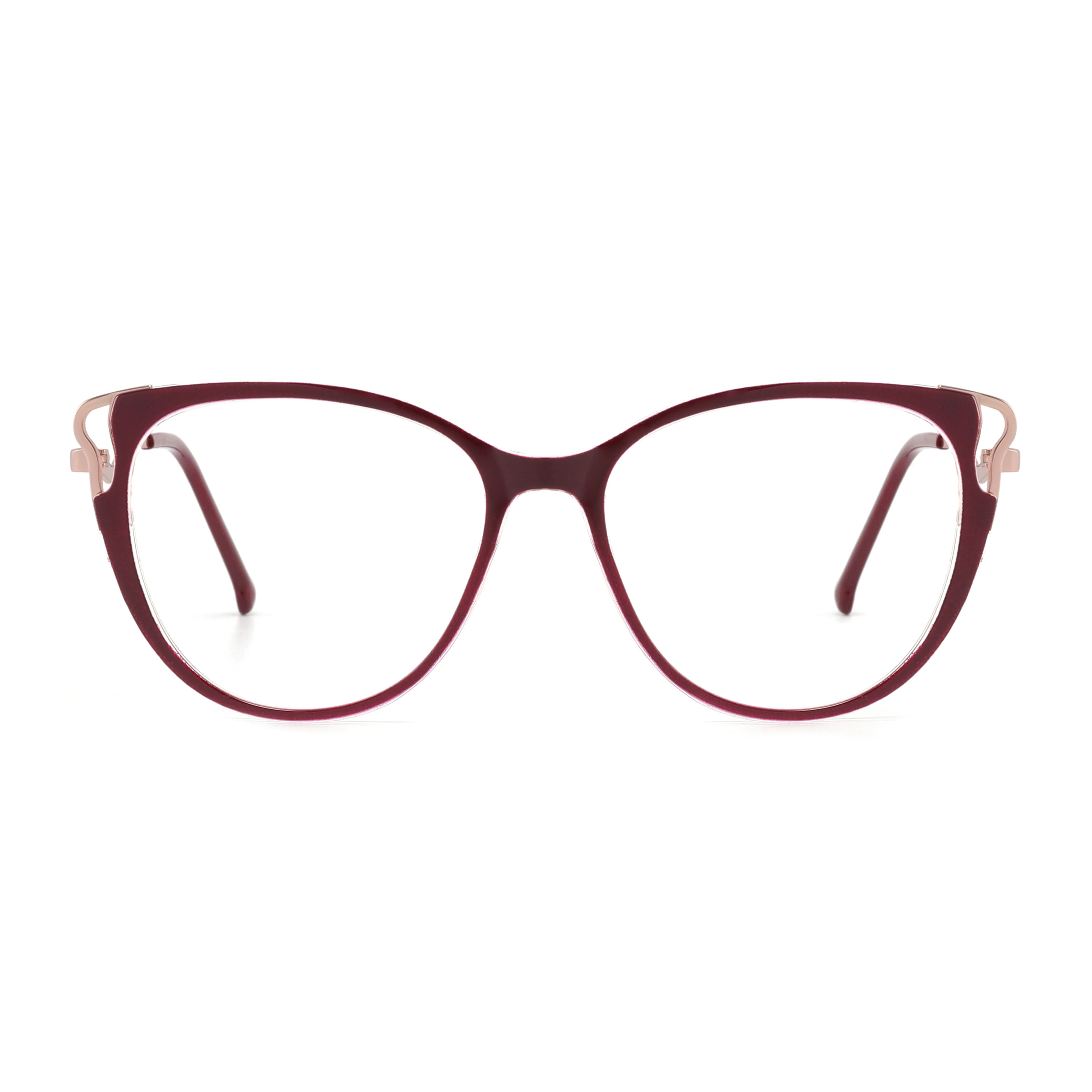 With bold red and gold contrast, this pair of cat eye glasses delivers instant visual impact. Crafted from TR90 and metal, the frame is durable, lightweight, and designed for stylish women on the move.
