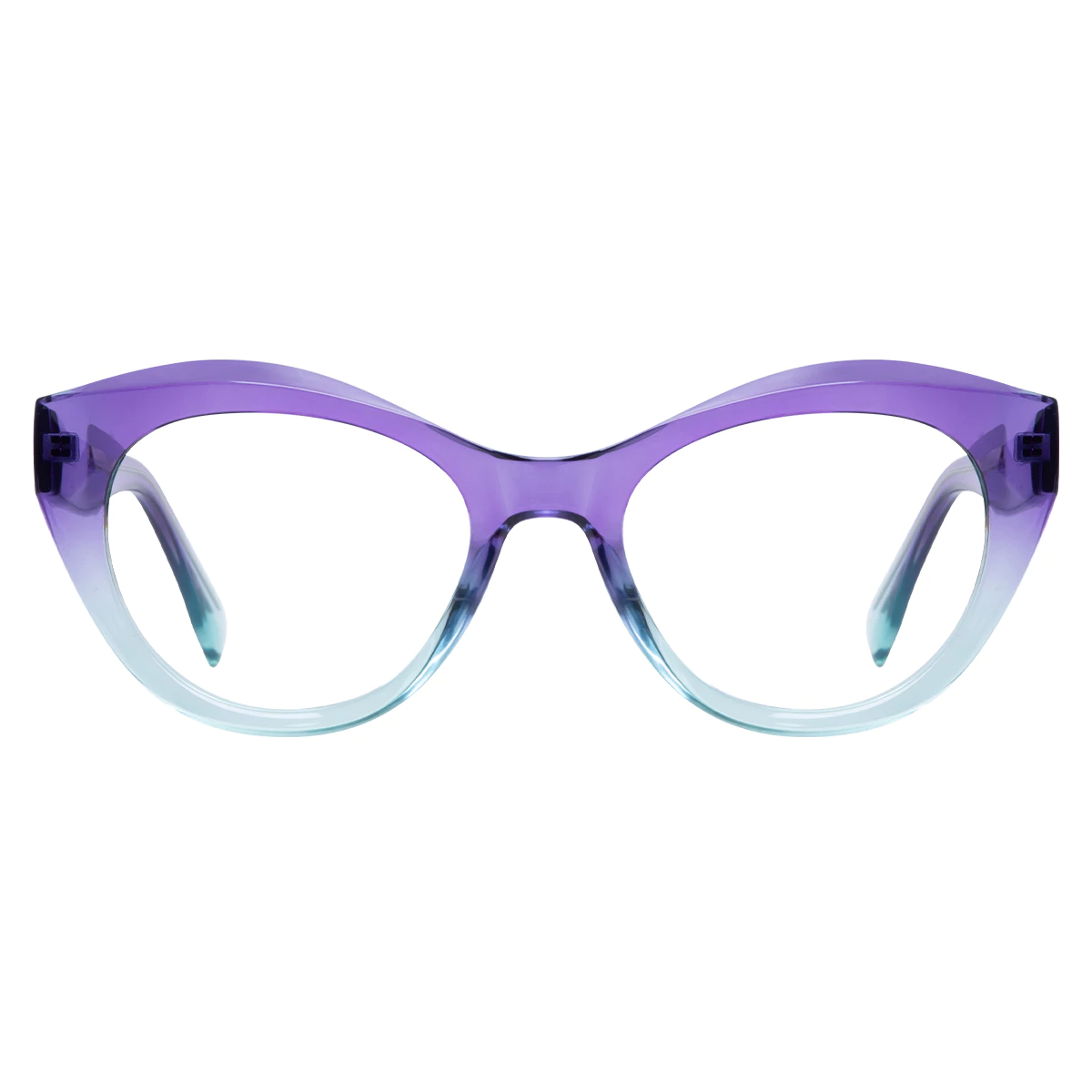 Experience a bold and artistic look with these purple-blue cat-eye eyeglasses. The rich purple and striking blue colors combine to create a vibrant and expressive accessory.