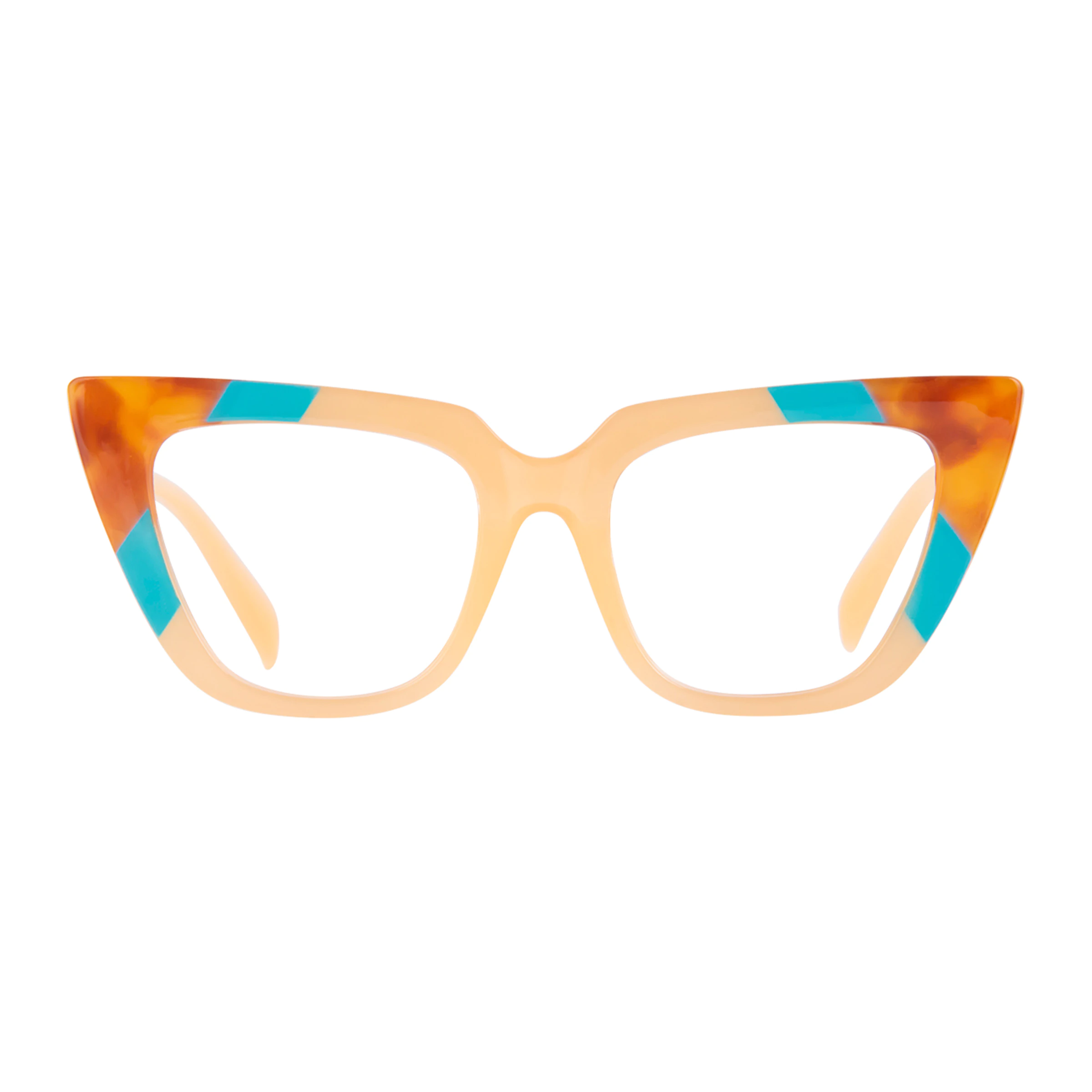 Add a splash of fun to your eyewear collection with these Orange-Blue Cat-Eye glasses. The dynamic color combination makes a vibrant statement, perfect for outdoor activities or casual gatherings. Made from PC, they offer both comfort and style.