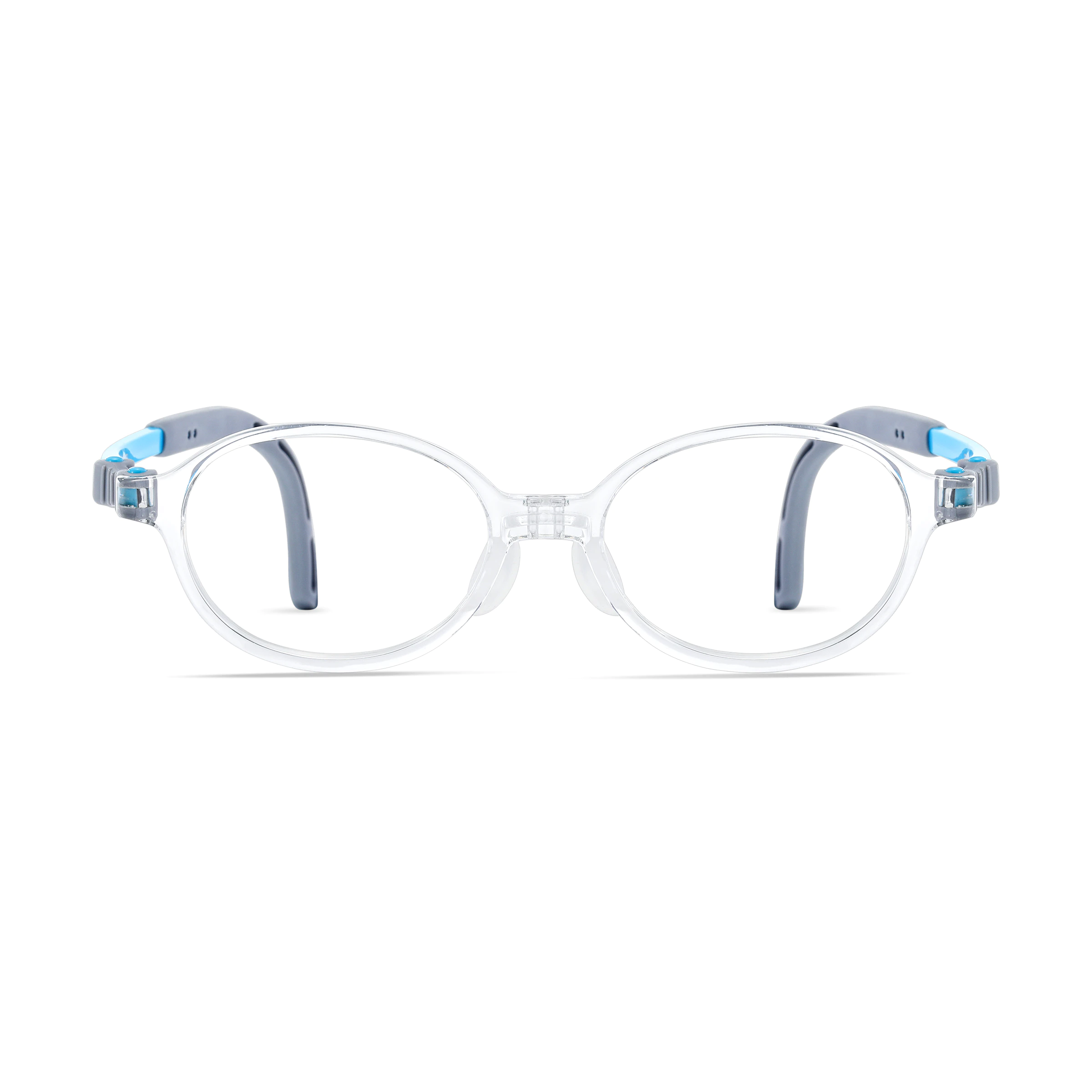 · Cool Color Combo – Clear frame with blue temples and gray tips for a sporty, modern look.