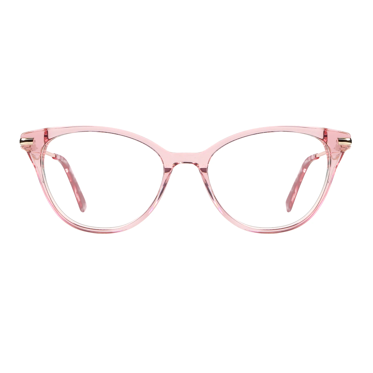 The Pink and Gold Oval Cat-eye glasses blend a playful pink acetate with luxurious gold accents. This combination adds a touch of whimsy to your look while maintaining a sophisticated edge. Perfect for brightening up both everyday and special occasions.