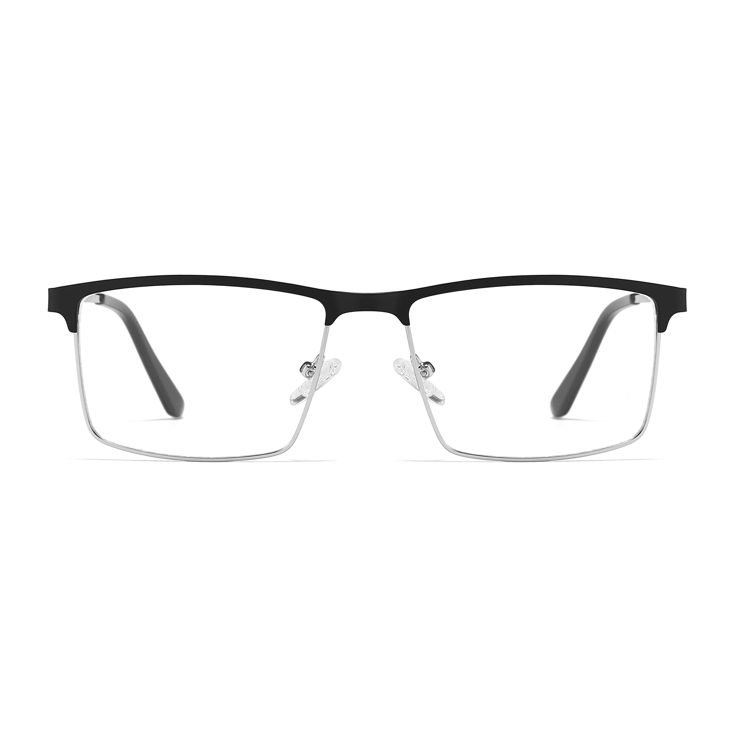 Combining black and silver tones, these full-rim rectangle glasses offer a refined and balanced design for a polished, professional appearance. Made from durable metal, they are lightweight yet sturdy, perfect for daily wear. The sleek lines and minimalist profile make them ideal for business and formal occasions, delivering timeless style with a modern edge.