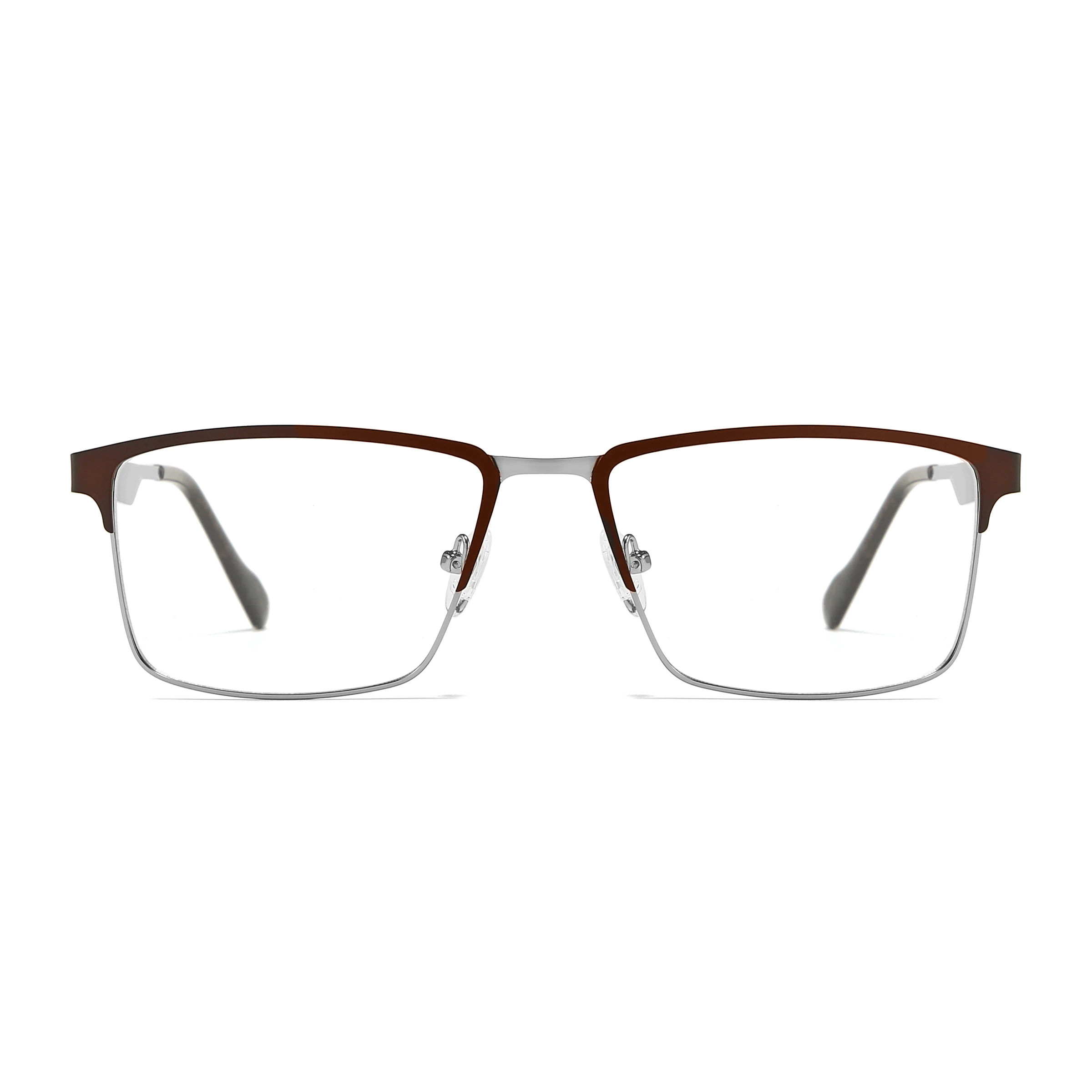 These men’s business glasses feature a classic brown full-rim metal frame in a rectangular shape. Designed for professional and timeless style, they offer durability and lightweight comfort for all-day wear. Ideal for enhancing a polished and confident look in any business setting.