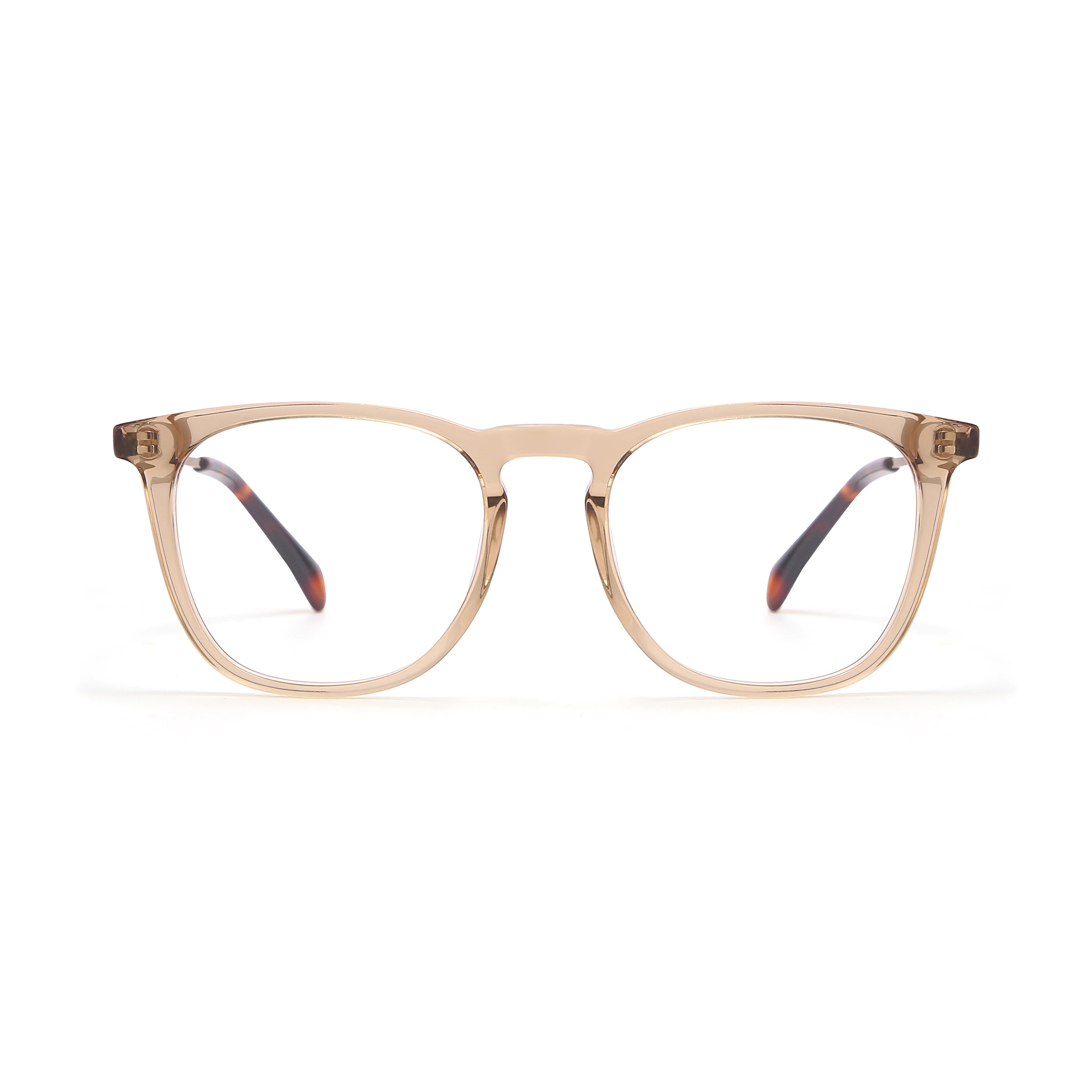 Glasses shows off a seamless fusion of metal and acetate, featuring a sleek square design that’s both understated and alluring. The full-rim face front is adorned with translucent light brown acetate and complemented by textured gold accents, perfect for everyday versatility.